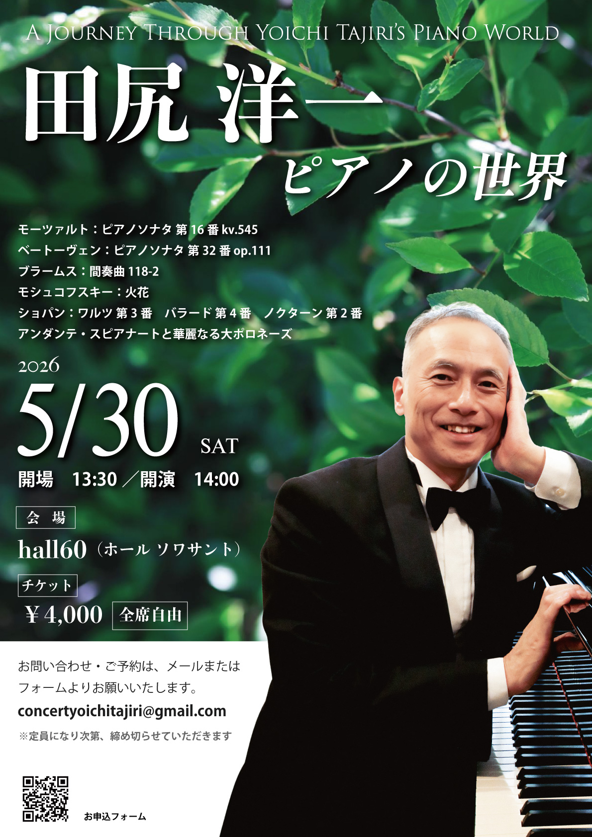 2026.05.30 SAT 田尻洋一 ピアノの世界 会場 hall60 東京都渋谷区神宮前6-34-14 原宿表参道ビルB2F ...